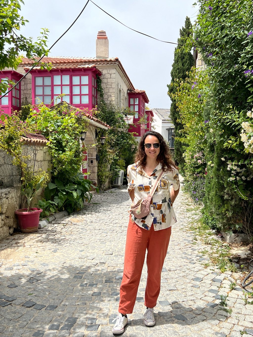 Alaçatı es un encantador pueblo cercano a Çeşme, conocido por sus calles adoquinadas, arquitectura de estilo griego y muy pero que muy fotogénico. Es famoso por sus viñedos, molinos de viento y ambiente bohemio, aunque para nuestro gusto se ha vuelto demasiado turístico estos últimos años. En sus calles de adoquines y arquitectura tradicional encontraréis balcones llenos de flores, muchas tiendas de artesanía y boutiques donde se venden joyas, ropa y también algunas galerías de arte.