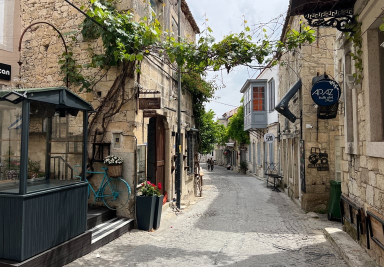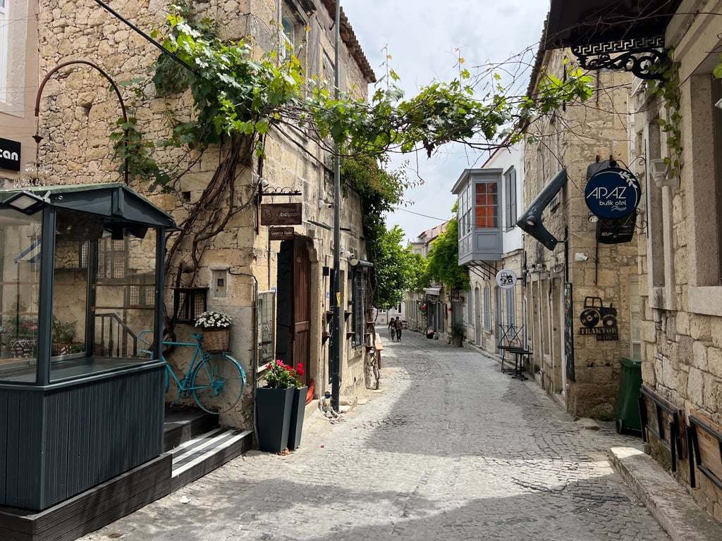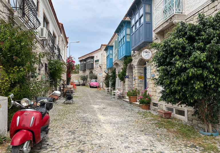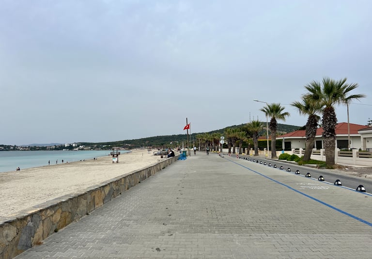 Este es un encantador pueblo costero ubicado al sur de Çeşme. Es conocido por su ambiente tradicional y tranquilo, y nos sorprendió porque el pueblo ofrece una experiencia más auténtica y relajada que otras zonas turísticas de la región. Sus playas están menos concurridas, y tienen aguas cristalinas ideales para nadar y practicar deportes acuáticos. En Çiftlikköy, es común ver casas de arquitectura típica egea y pequeños restaurantes familiares que sirven especialidades locales. Es una excelente opción para quienes buscan una escapada pintoresca y tranquila, con muy fácil acceso a la vibrante vida y las atracciones de Çeşme. Se puede llegar incluso a pie, pues existe un paseo que une ambas localidades y que transitamos uno de los días.