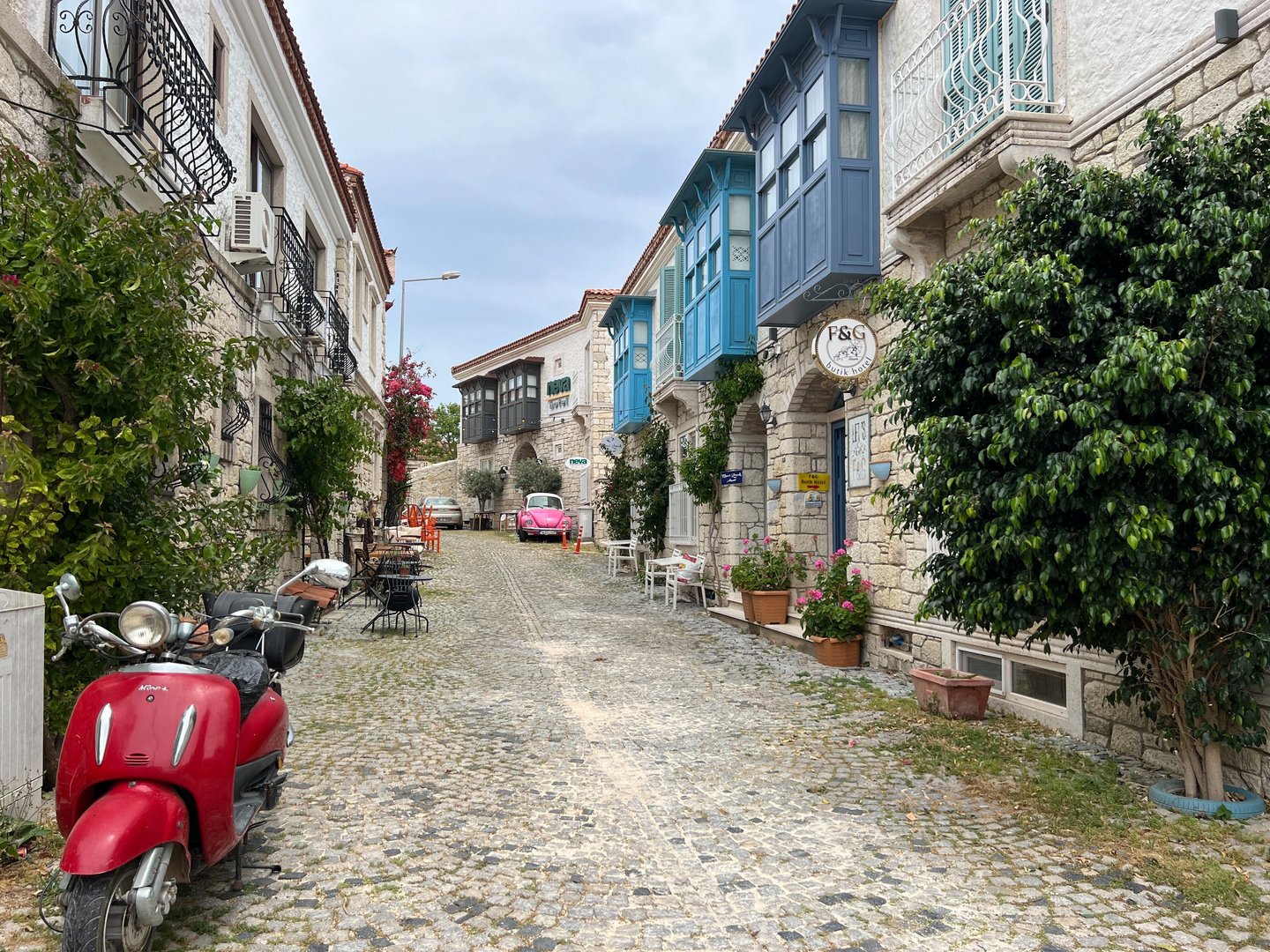 Tanto Çeşme como Alaçatı ofrecen infinidad de opciones de alojamiento aunque bastante diferente: Çeşme es un pueblo lleno de vida y comercio local en el que el turismo se disimula y está bien integrado en el lugar; también cuenta con un bonito paseo marítimo y está mucho más poblada que su vecina (unos 30.000 habitantes). Alaçatı, en cambio, es un pueblo coqueto y muy bonito, pero demasiado enfocado en el turismo para nuestro gusto (esa es la sensación que nos dio). Eso sí, cuenta con una oferta de alojamiento espectacular, con pequeños y preciosos hoteles-boutique con piscina y con una pinta estupenda, pero algo más caros que los de Çeşme.
