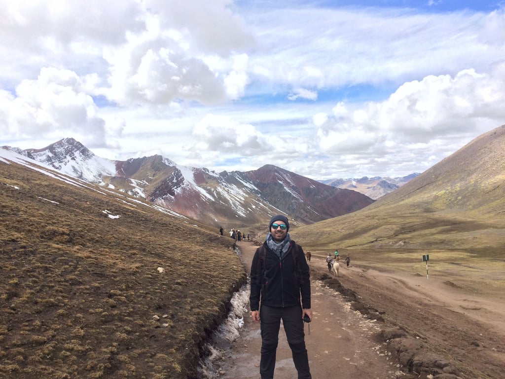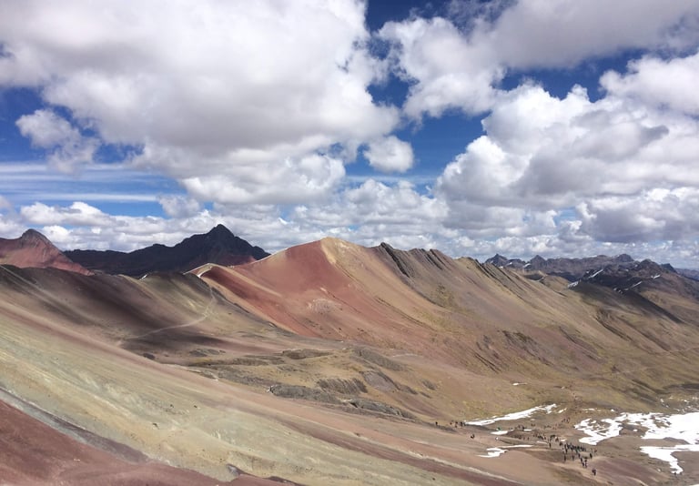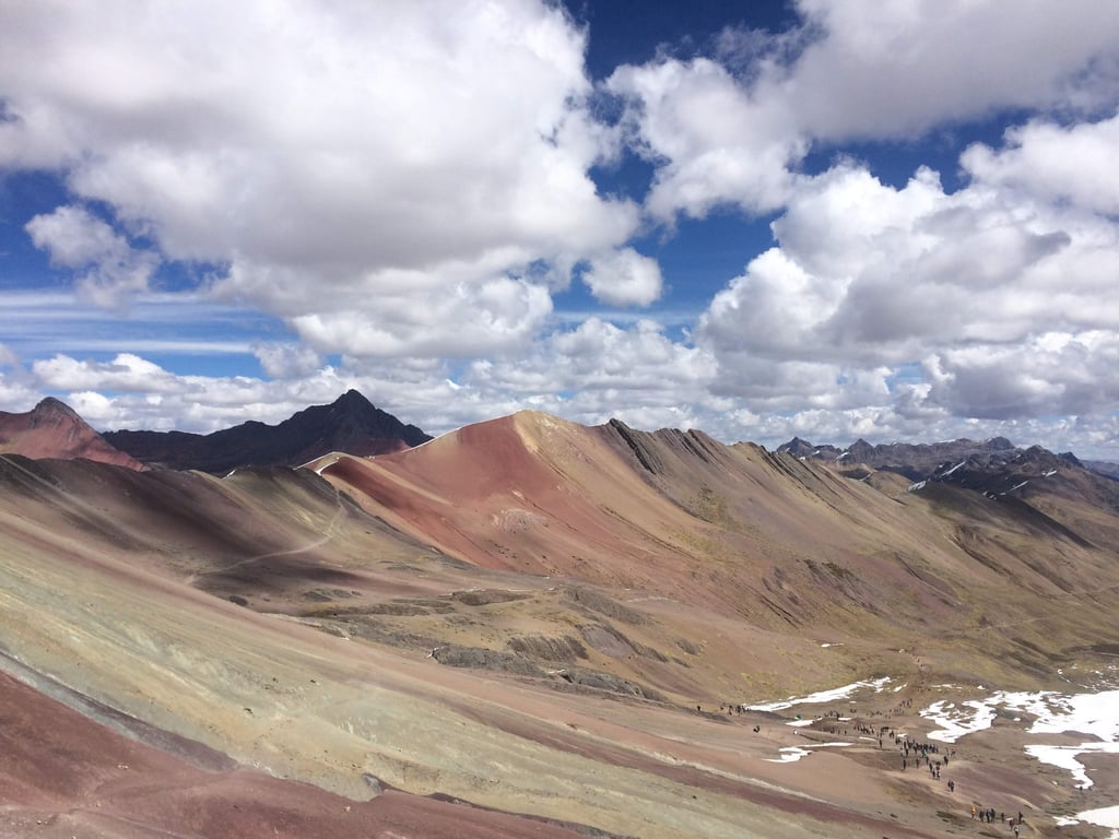¡Lo habéis conseguido! Tras un ascenso desafiante, podréis disfrutar de la panorámica única de los colores de la montaña, rodeados de impresionantes paisajes andinos y el Nevado Ausangate al otro lado. Las vistas son impresionantes. Además, si estáis demasiado fatigados y os cuesta subir la última parte, suele haber mulas que pueden ayudaros en la ascensión final a cambio de un módico precio, aunque nosotros os recomendamos que lo hagáis por vuestra cuenta.