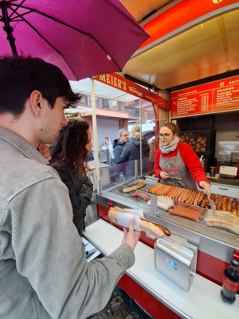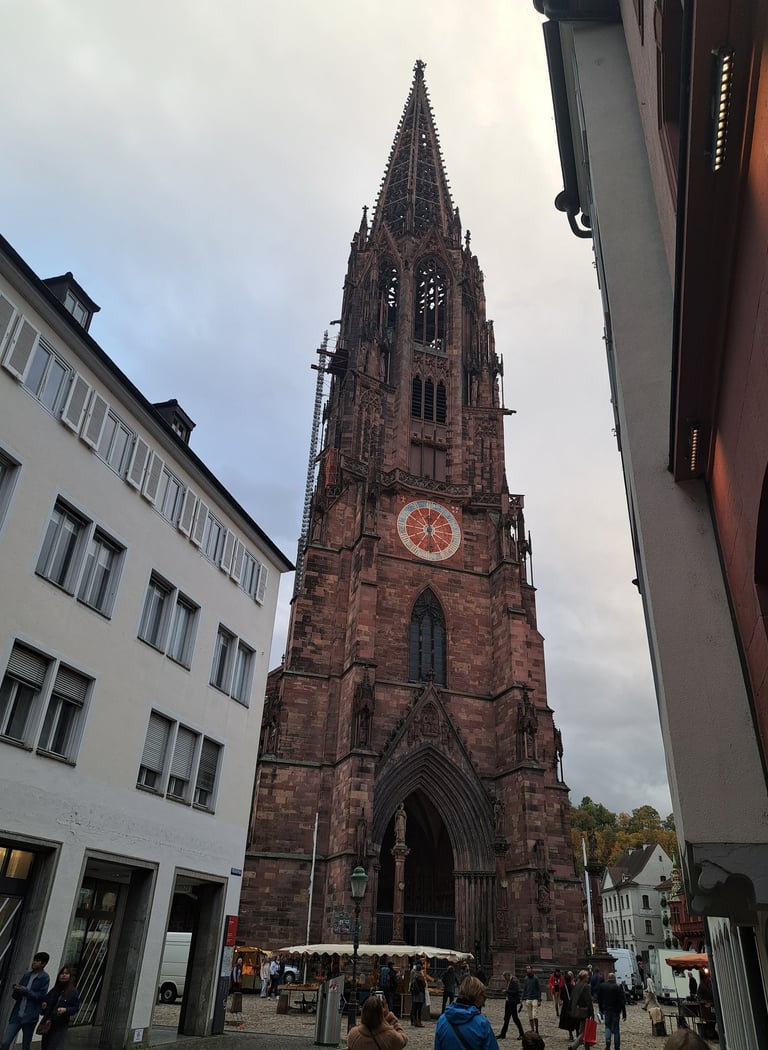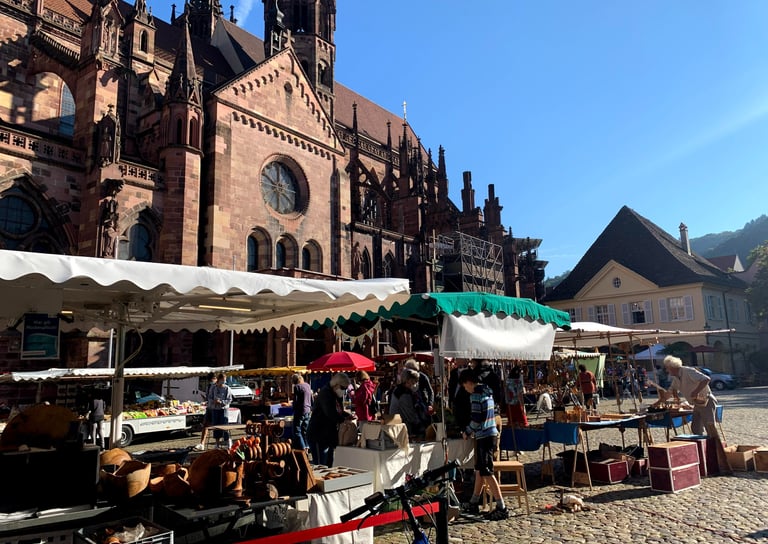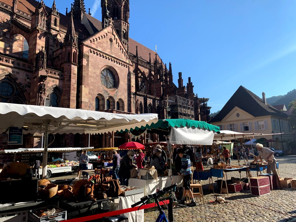 La plaza de la catedral, conocida como Münsterplatz, es el corazón de la ciudad y donde se celebra el animado mercado de productos locales a diario (excepto los domingos). Aquí podréis encontrar productos de la Selva Negra, artesanías, flores y todo tipo de especialidades culinarias. No os vayáis del mercado sin probar las salchichas, ¡están deliciosas y a muy buen precio!