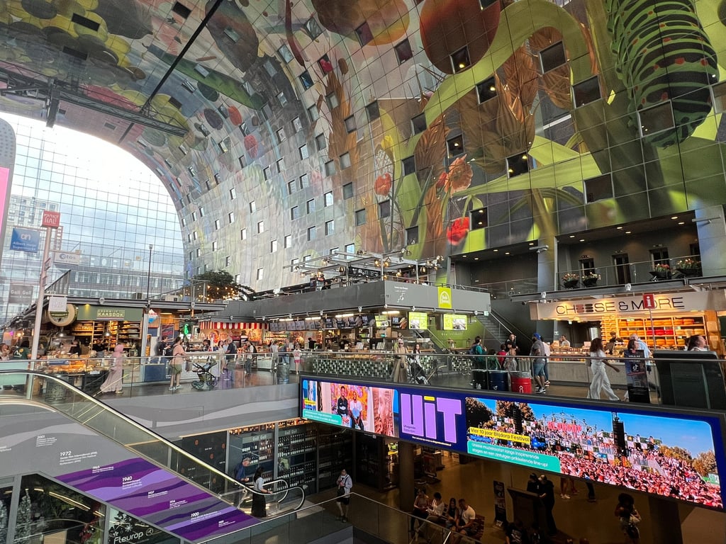 Apenas descansamos antes de salir a conocer la segunda ciudad más importante del país de la que, sinceramente, nos esperábamos muy poco; sin embargo, Róterdam nos sorprendió gratamente. Es cierto que su estética no es de las más hermosas, pero cuenta con bastantes atractivos y planes para realizar. Aquella tarde, recorrimos el bonito puerto viejo u Oude Haven, pasamos por las famosísimas casas cubo de Róterdam y entramos al Markthal, uno de los mercados más espectaculares que hemos visto. Está construido dentro de un edificio inmenso semicircular que tiene unos coloridos dibujos en el interior y una enorme cristalera. En el Markthal hay decenas de foodtrucks con platos de todo el mundo y es uno de los mejores sitios para comer en la ciudad.