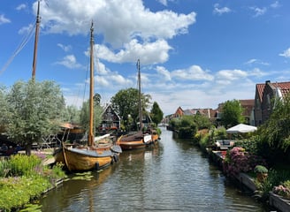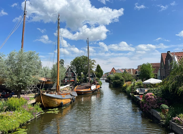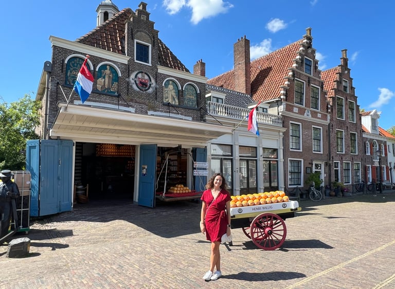 Así que fuimos caminando los 3 kilómetros junto a un canal hasta el pueblito de Edam. No nos esperábamos gran cosa de este pueblito; sin embargo, es uno de los que más nos ha gustado. Nos sorprende la poca gente que se anima a visitarlo. Es muy bonito, tranquilo y quizá el más bucólico. No hay mucho para ver en Edam, pero era miércoles y coincidimos con el día de la subasta de queso que se celebra durante el verano. Además, tiene un canal precioso en el que se puede dar un paseo en barco.