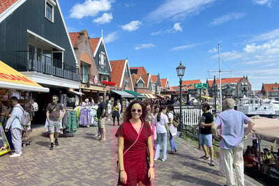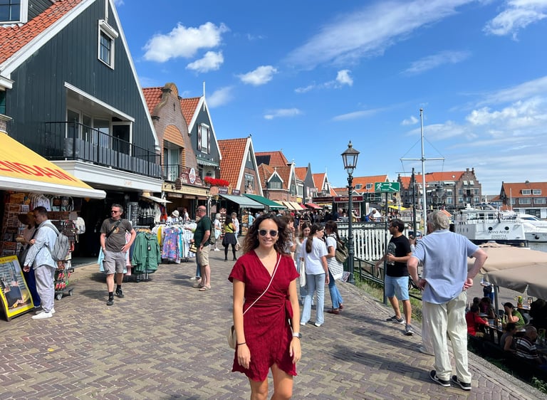 Teníamos bastante vista la capital y decidimos ir directamente a Volendam, un pueblo costero muy turístico a media hora en autobús desde la estación de tren. La verdad que es uno de los lugares mas visitados del país, pero no es de nuestros preferidos. Solamente tiene dos calles que merecen la pena y están abarrotadas en verano. El mejor plan en Volendam es pasear junto a la costa, probar alguna de las especialidades de pescado y entrar en la espectacular tienda de queso de la cadena Henri Willig. Paseamos hasta donde empieza el pequeño puerto deportivo, una zona a donde se acercan los lugareños y es mucho mas tranquila. Dudamos en coger el ferry a Marken, pero nos parecía que había demasiada gente y era muy caro.