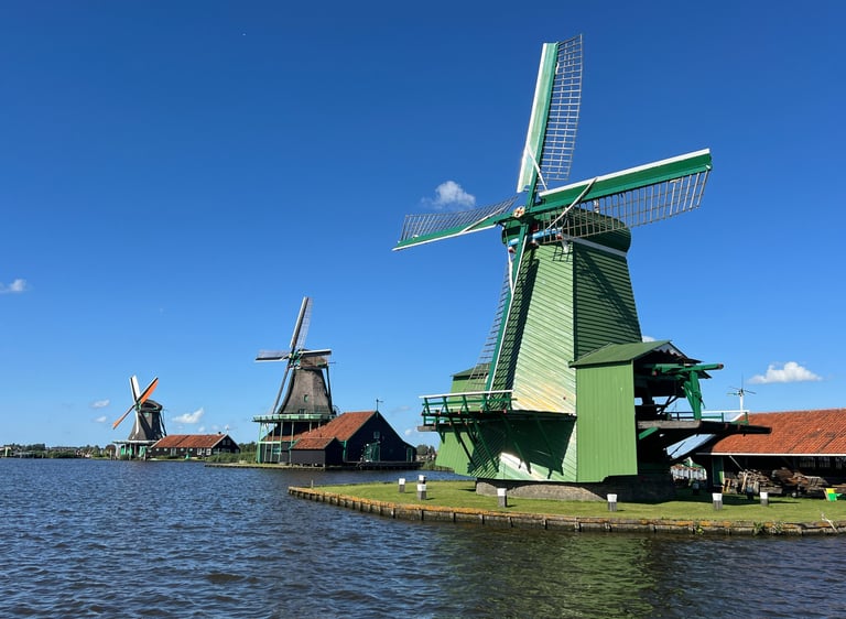 Por la tarde, cogimos un autobús en la estación de Edam para visitar otro de los lugares mas famosos del país: Zaanse Schans. Se trata de un barrio del municipio Zaandam que funciona como museo al aire libre con una colección de molinos históricos (la mayoría de más de 200 años), graneros y talleres donde se practica la artesanía. Es un lugar precioso y muy fotogénico, pero suele estar lleno de gente. Nos hubiera gustado visitar el centro de Zaandam, pero estábamos agotados para caminar más. Cogimos el autobús de vuelta a Ámsterdam y pasamos el resto de la tarde recorriendo sus canales. Celebramos la ultima cena en el Cannibale Royale, ¡totalmente recomendable!