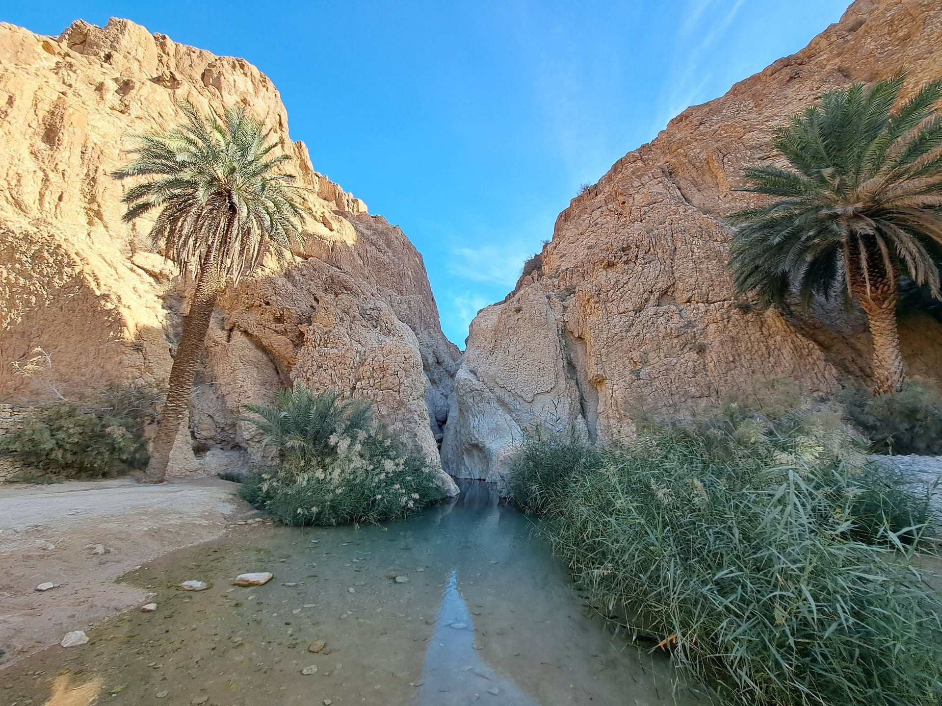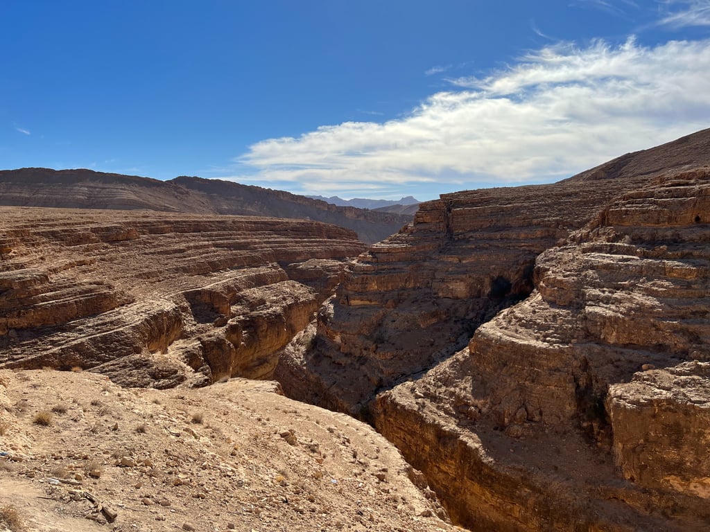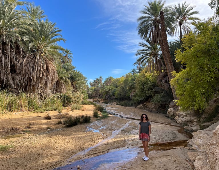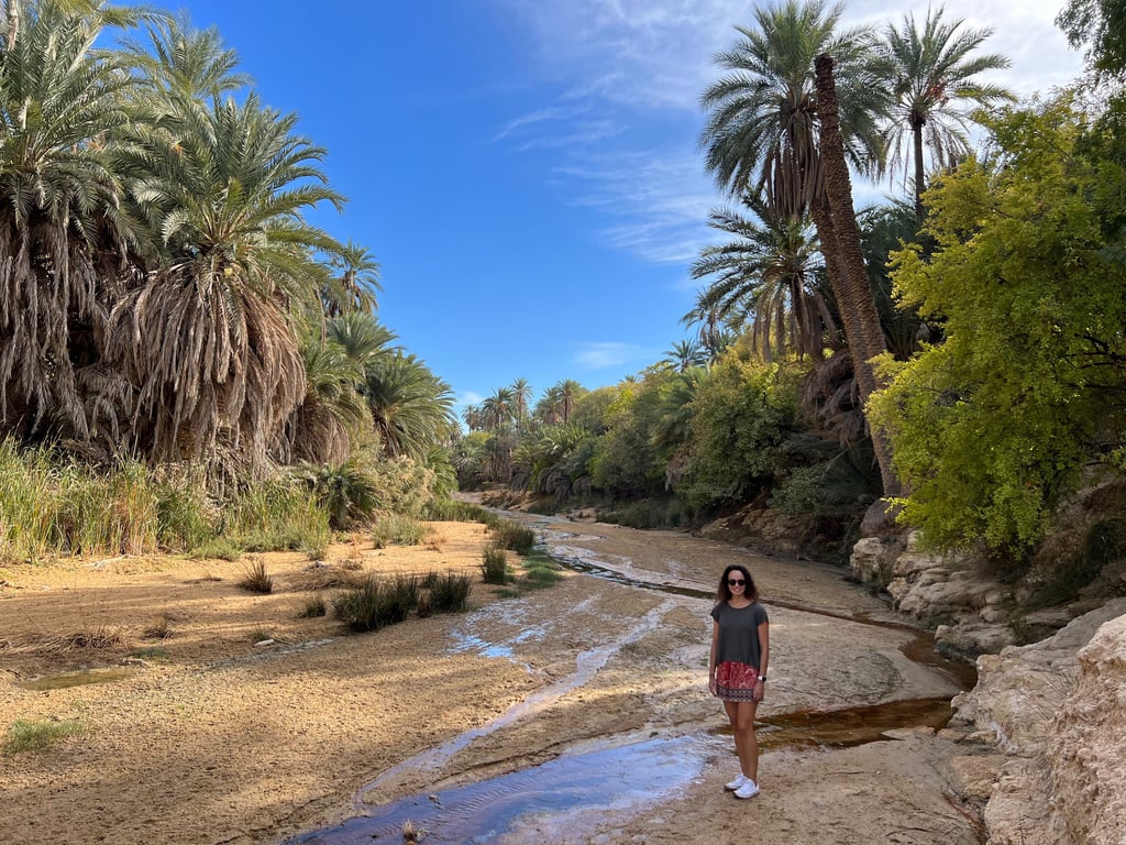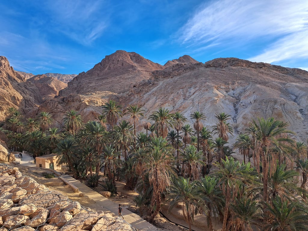 Este oasis, antiguamente habitado por los romanos y luego por los bereberes, conserva un encanto muy especial. Podéis recorrer las antiguas construcciones de piedra, disfrutar del sonido del agua y, si el calor aprieta, refrescaros en una de sus pozas naturales, aunque parece que en estos momentos el baño ya no está permitido (y nos parece de lo más lógico para conservar el entorno). Además, desde las alturas del cañón se obtienen unas panorámicas impresionantes del valle y del desierto que se extiende hasta donde alcanza la vista.