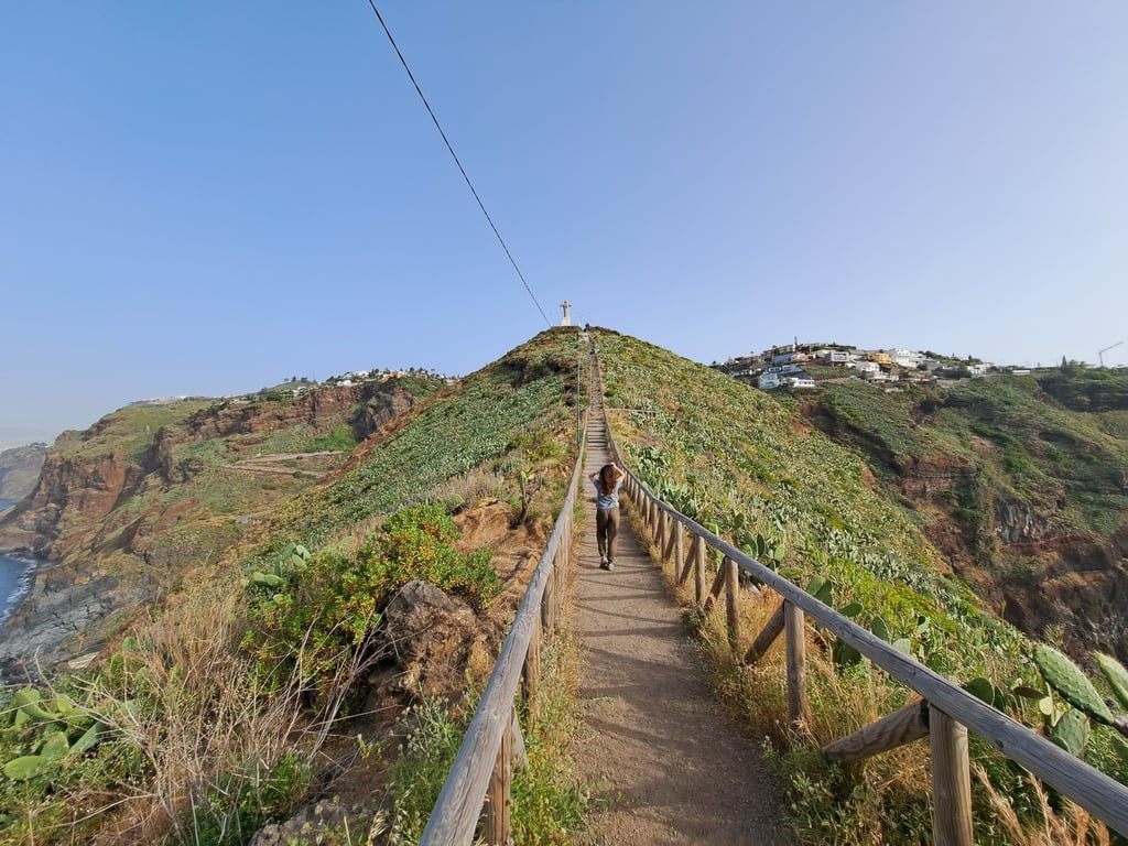 La última mañana que disponíamos de coche aprovechamos para conocer parte de la costa sureste de Madeira. Nos acercamos al Miradouro do Pinaculo, pasamos por el Miradouro das Neves y llegamos al famoso Cristo Rei, una escultura al borde del mar, similar al Cristo Redentor en miniatura.