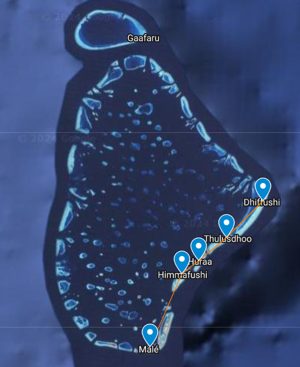 Esta es la segunda isla en la que estuvimos alojados durante otras cuatro noches. Ubicada casi en el Atolón Malé Sur, Guraidhoo tiene un tamaño similar al de Dhiffushi, aunque su población es de aproximadamente el doble, alrededor de 3.000 habitantes. Para llegar las opciones son muy similares a las de Dhiffushi; se puede ir en el ferry público 309, partiendo del puerto de Malé, y también en speedboat, si se necesita ir en horarios diferentes o se prefiere ir directamente desde el aeropuerto. Os dejamos también un mapa del Atolón Malé Sur.