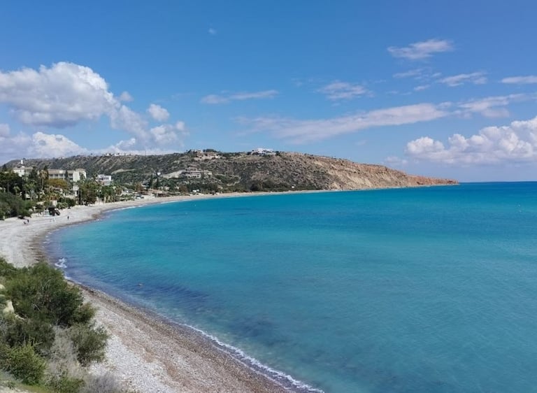 Según la mitología griega Afrodita, la diosa del amor y la belleza, nació en esta playa pedregosa, situada en la costa sur de Chipre, no muy lejos de Pafos. En este precioso enclave, destacan las formaciones rocosas de Petra tou Romiou, uno de los paisajes marinos más emblemáticos de la isla. La playa en sí es una preciosa bahía en forma de herradura y con un mar de fuertes corrientes con las que hay que tener precaución.