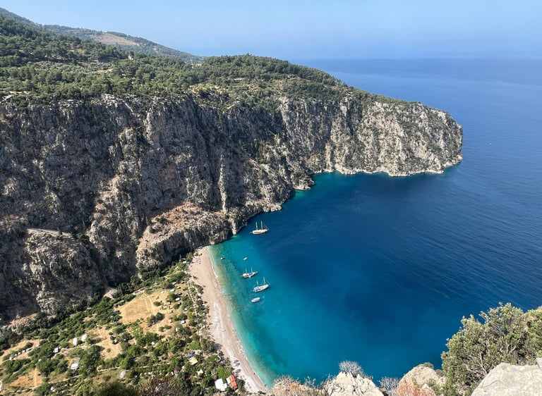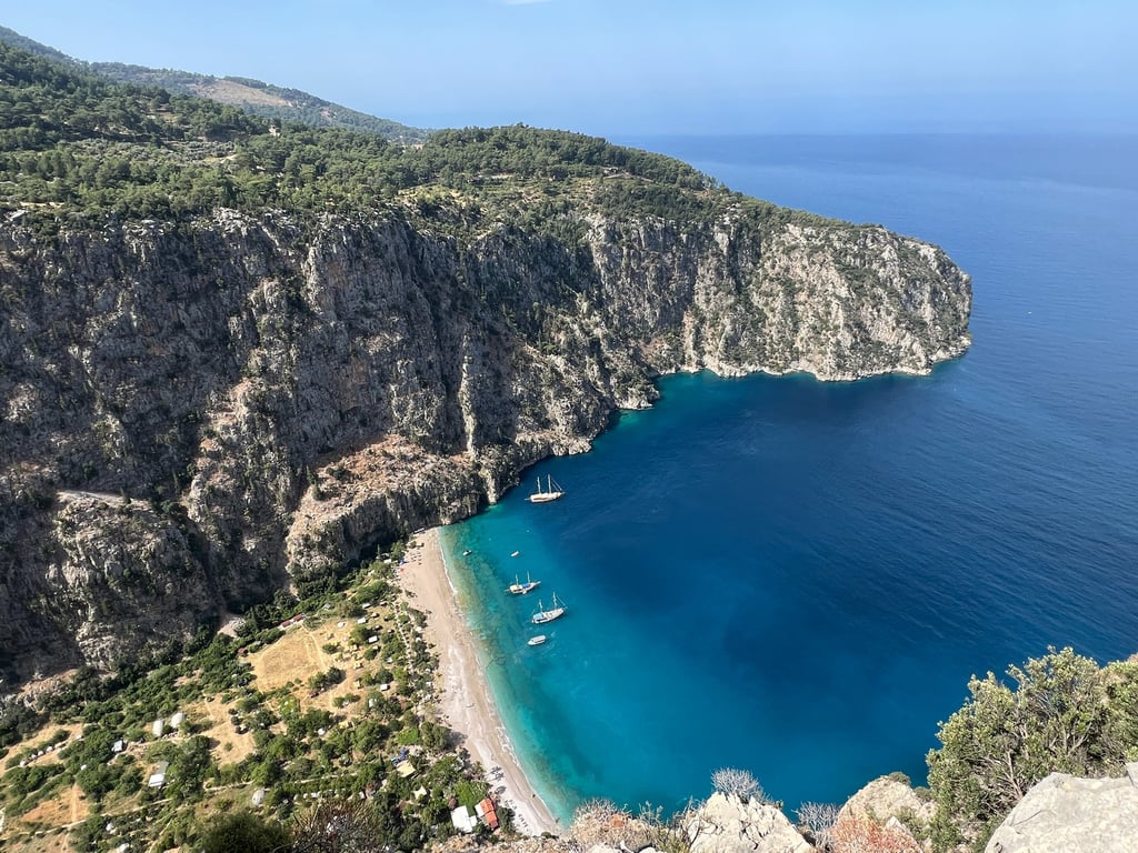 Desde allí, podéis continuar la ruta hasta el Valle de las Mariposas (Kelebekler Plaji en turco). Para acceder a la parte baja hay que ir en barco desde Olüdeniz, pero desde el mirador junto a la carretera se puede disfrutar de una de las vistas más icónicas de toda la Riviera Turca. El autobús que sale desde Olüdeniz hace una parada justamente al lado.