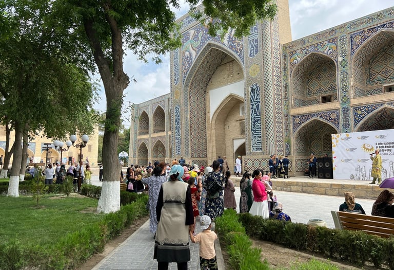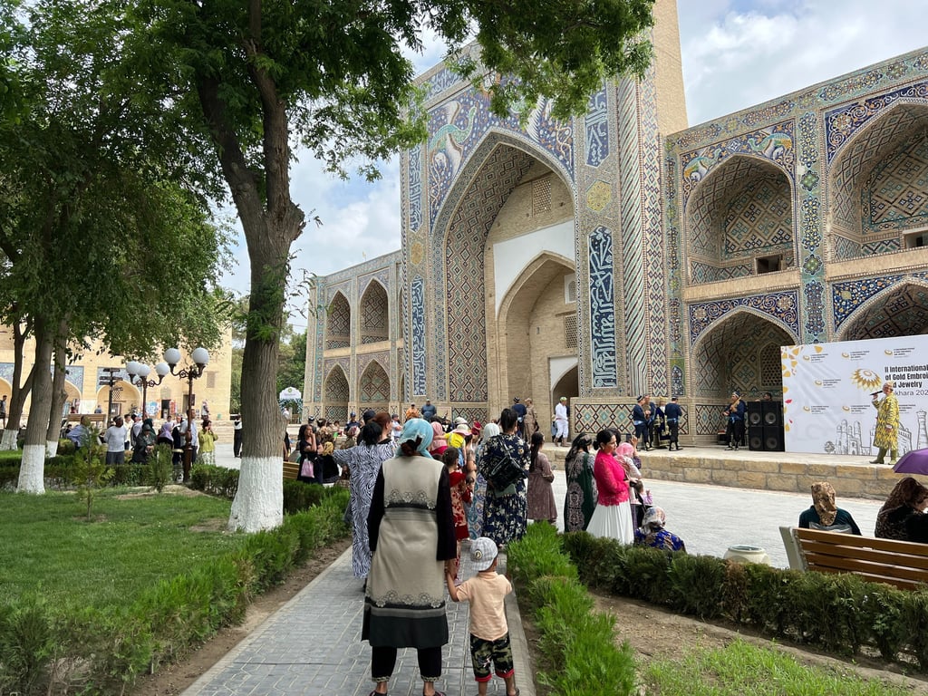 El complejo incluye la Madraza Nadir Divan-Begi y la Juguetona estatua de Hoja Nasreddin, un personaje popular en las leyendas del Asia Central.