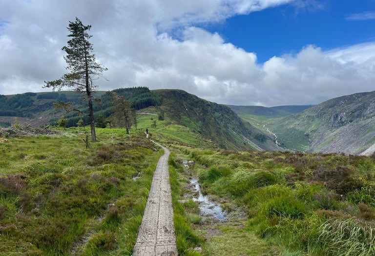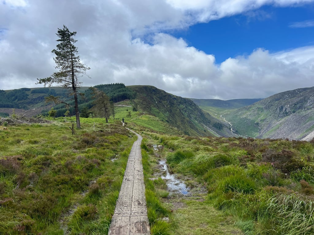 Aparcamos el coche cerca del centro de visitantes y, desde allí, visitamos la antigua torre de piedra, la iglesia y el famoso cementerio, llegando al lago inferior. Continuamos por el sendero a través de un bosque, hasta el lago superior, más grande y hermoso que el anterior. (Aquí también se puede aparcar el coche, pero recomendamos dejarlo abajo para hacer el recorrido completo). Desde el lago superior comienza la ruta The Spinc, con una subida muy empinada, pero relativamente corta, y unas vistas que merecen totalmente el esfuerzo. Continúa atravesando el valle por la zona más alta hasta el final del lago superior y justo al empezar el camino de regreso, se pasa por los vestigios de un antiguo pueblo minero.