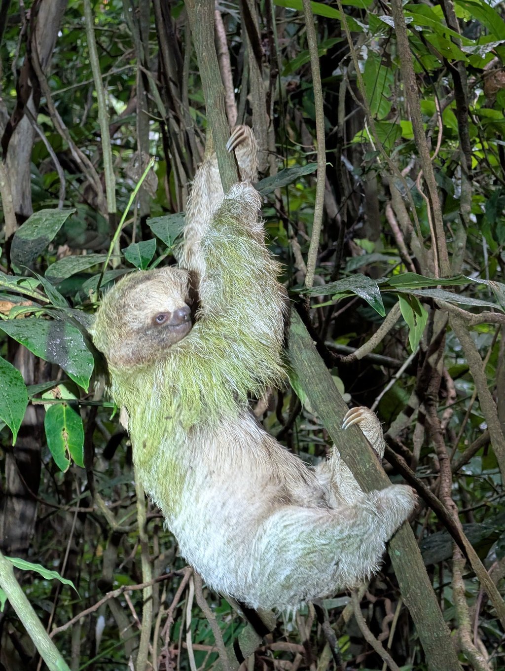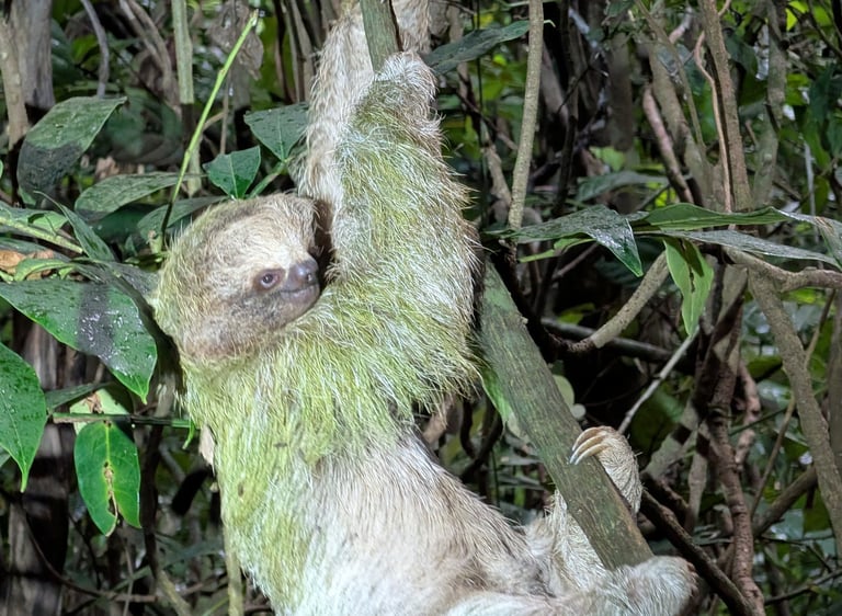 Habíamos quedado para hacer un tour de animales al atardecer en TAPIRS Home, en Bijagua, con Alisson y Edgardo. Aquí encontraréis su ubicación exacta, así como toda la información necesaria para poder reservar directamente por Whatsapp. Y fue, sin duda, una de las experiencias más auténticas y especiales del viaje. Vimos aves dormidas, perezosos, uno de ellos bajando al suelo a apenas un metro de nosotros, ranas de mil colores, tarántulas, serpientes, huellas de tapir, colibríes en su nido… Todo en un ambiente íntimo, sin prisas, con gente apasionada por lo que hace y con una cercanía que echamos mucho de menos en otros lugares más explotados turísticamente.