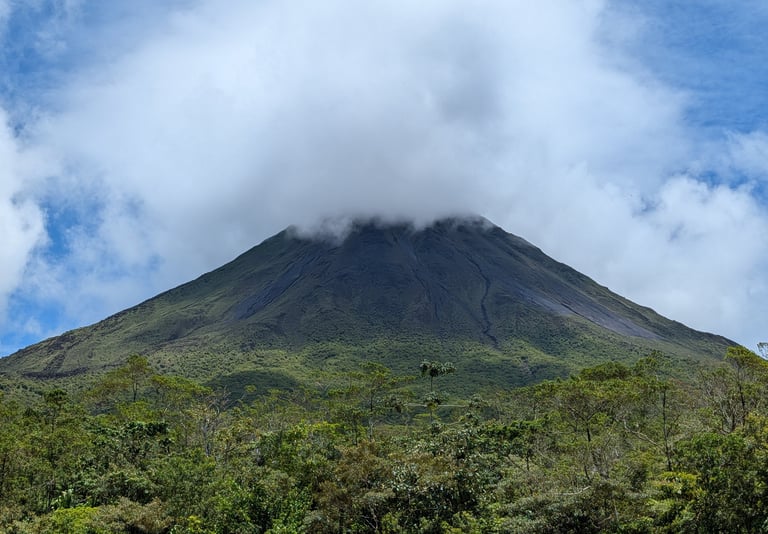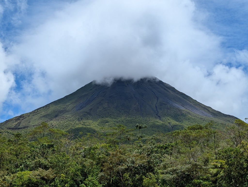 Esa mañana fuimos pronto al Parque Nacional Volcán Arenal para entrar a primera hora. Ser de los primeros siempre ayuda, y más en países como Costa Rica donde el turismo de naturaleza mueve muchísima gente. El volcán no se dejó ver del todo, pero el parque nos regaló fauna por un tubo: tucanes, coatíes, aves enormes de aspecto casi prehistórico, colibríes… Solo por eso ya mereció mucho la pena.