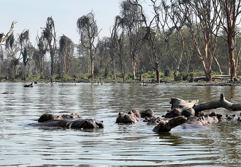 Por la mañana temprano, condujimos hasta llegar al Lago Naivasha, un lugar que anteriormente también lucía con miles de flamencos. En la actualidad, la fauna se limita a mamíferos herbívoros como antílopes de agua, muchas especies de aves y la estrella del parque, los hipopótamos. Bordear el lago en barca para ver los hipopótamos de cerca es una gran idea.