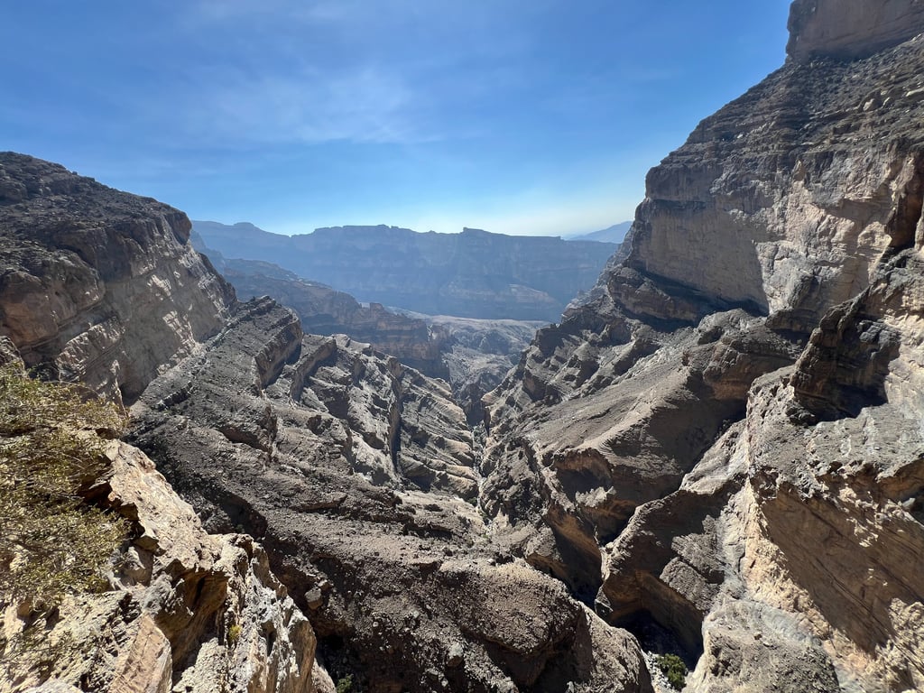 Llegó el día de trekking de nuestro itinerario por Omán, y no podía ser en otro sitio que en Jebel Shams. Hay que conducir una hora desde Al Hamra para llegar al inicio de la ruta y NO es necesario tener un 4x4 (aunque hay algunos tramos bastante pedregosos). El recorrido del Balkony Trail son 10 kilómetros de ida y vuelta, por un camino junto a un acantilado espectacular. No hay que confundirse con la subida a la cima de Jebel Shams, ni con otras rutas menos señalizadas. Hacía mucho viento y fue la única vez que sentimos fresco durante el viaje (conviene mirar el pronostico meteorológico por si es necesario llevar más abrigo, sobre todo en invierno).