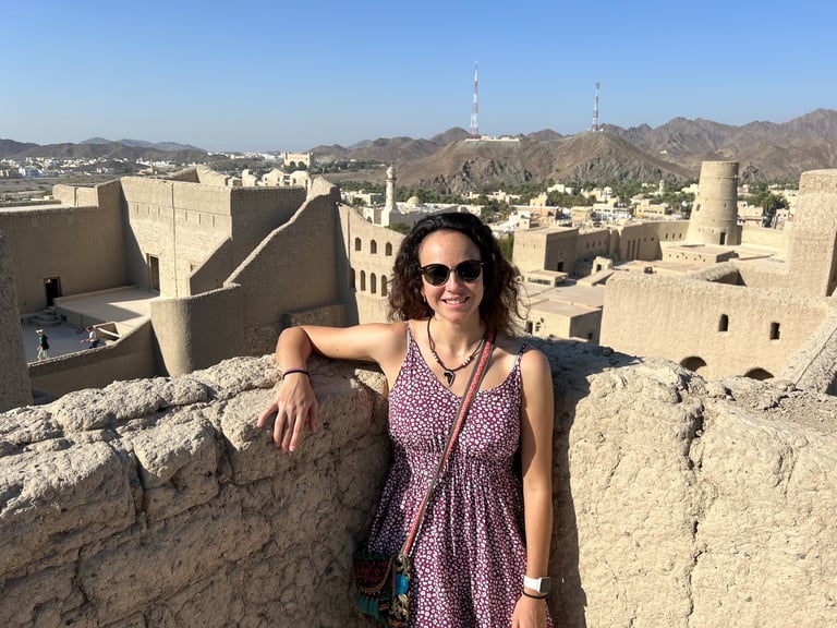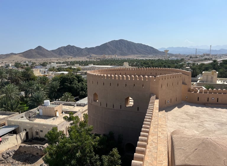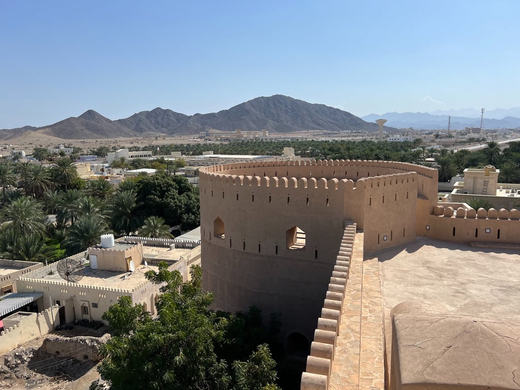 A media mañana, salimos con el coche de vuelta hacia Muscat, pero antes de llegar paramos en el último fuerte incluido en nuestro itinerario: el Fuerte de Al Hazm. Éramos los únicos visitantes del lugar, lo que le daba un toque de misterio. Es el fuerte que mejor ambientadas tiene las estancias interiores y, en general, uno de los más bonitos del país. ¡Las vistas desde la terraza son espectaculares! No muy lejos, hay dos fuertes interesantes que no visitamos por falta de tiempo: el Fuerte de Nakhal y el Fuerte de Rustaq.