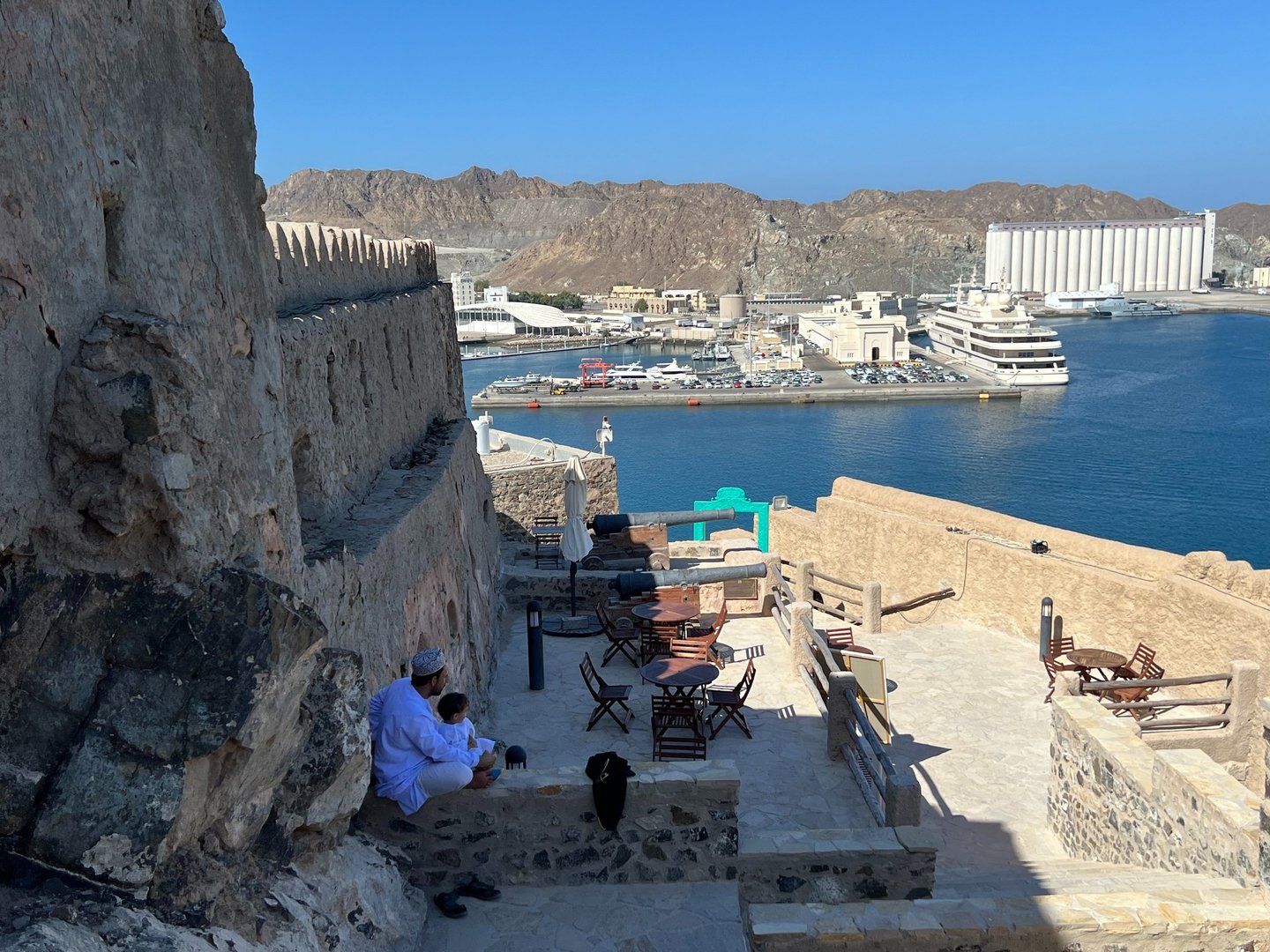 Por la tarde, recorrimos parte de la carretera que bordea la costa hacia el este, hasta llegar al barrio Old Muscat. Es una zona agradable y muy bonita, con una preciosa vista de la bahía rodeada de montañas escarpadas. Allí se encuentran el Palacio Real, que solamente se puede ver desde el exterior, y los Fuertes Al Mirani y Al Jalali.