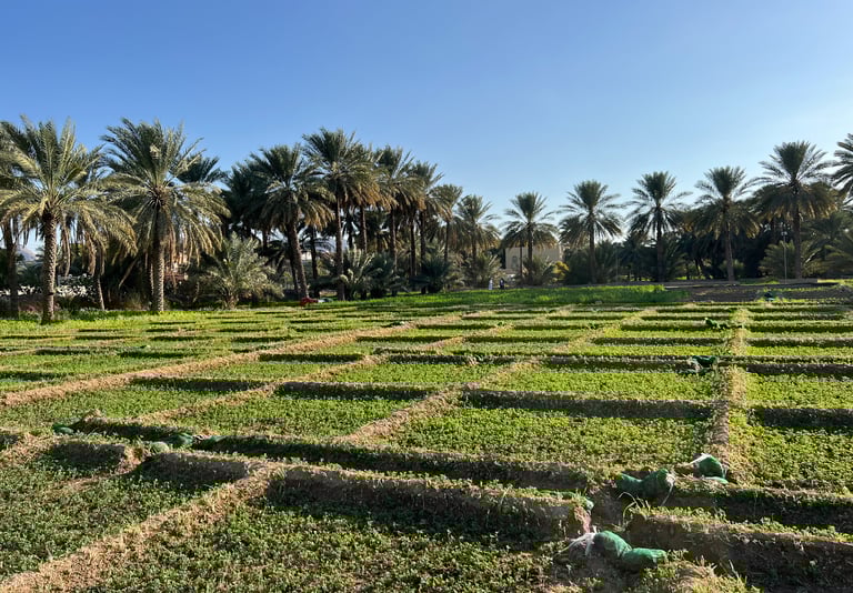 Por la tarde, después de hacer un pequeño picnic junto al castillo, llegamos al siguiente destino: la ciudad de Al-Hamra. Es uno de nuestros lugares favoritos del viaje; un conjunto extenso de calles y casas, algunas de ellas de adobe, sumergidos entre plantaciones de palmeras datileras y canales de riego. Es un lugar idílico, un oasis en un país donde la vegetación y el verde no abundan. Desde nuestro alojamiento (Hotel Bait Salam inn) teníamos unas vistas privilegiadas de los campos y de Jebel Shams, la montaña más alta del país. Dimos una vuelta por Al-Hamra al atardecer, sintiéndonos muy afortunados de haber conocido este lugar.