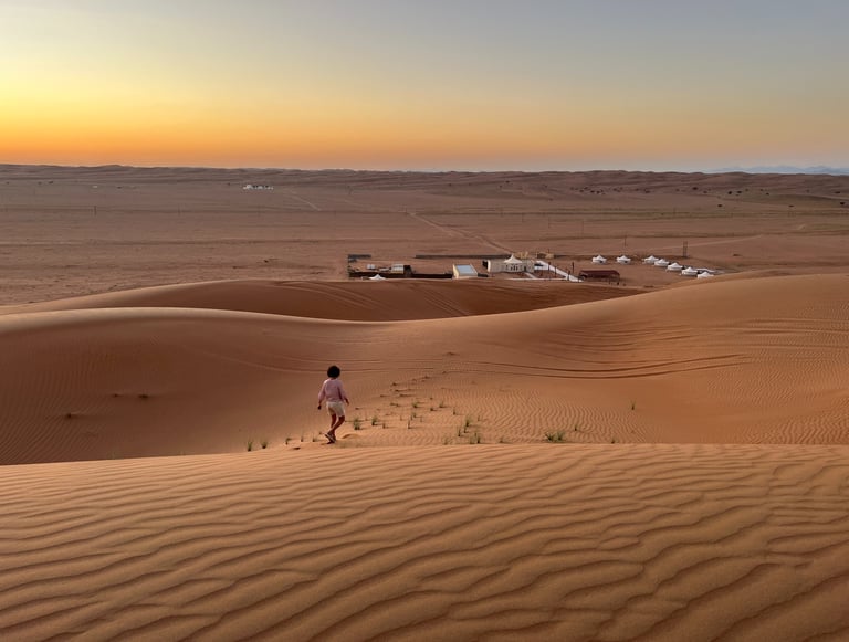 Después de comer allí mismo, condujimos un par de horas más hasta el desierto Wahiba Sands. No tuvimos problemas para llegar, excepto en el último tramo donde se atascó una rueda del coche en la arena. Logramos sacarla y llegamos a Al Salam Camp, para antes del atardecer. El campamento recientemente había abierto sus puertas y las instalaciones eran excepcionales, ¡os recomendamos muchísimo!. Tuvimos tiempo de subir andando a las dunas, que a diferencia de la mayoría de alojamientos, este sí se encuentra junto a la arena y no hace falta contratar ninguna excursión, y presenciamos uno de los atardeceres más espectaculares del viaje. La vista del desierto Wahiba Sands en forma dunas doradas lineales que alternan con corredores de valles más fértiles, y las montañas de fondo, es muy característica.