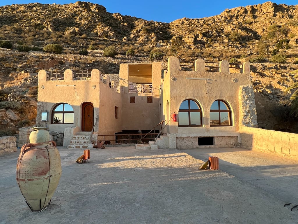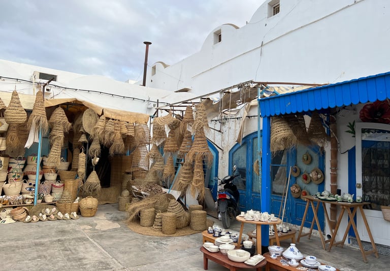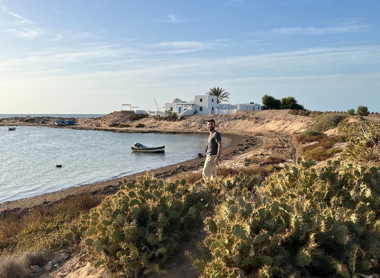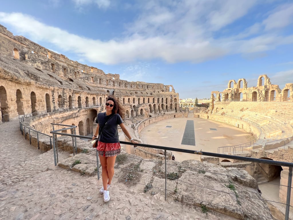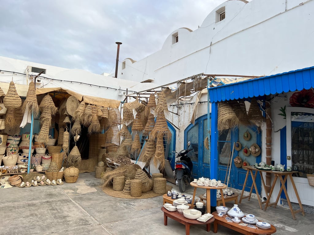 Desayunamos muy temprano porque nos esperaba un largo día. Primero visitamos el imponente y de poco renombre Coliseo de Djem, probablemente el segundo más espectacular que hemos visto, después del de Roma. Continuamos cuatro horas de carretera hasta Djerba, una isla insólita del sur, situada muy cerca de la frontera con Libia y patrimonio de la Unesco desde 2023. Djerba es muy diferente al resto del país, tanto paisajística como históricamente, y añade un importante valor cultural al pais. Nos alojamos en Maison Leila, una bonita villa con piscina, ubicada a menos de 10 kilómetros de las playas y de la ciudad principal Houmt Souk. Esta es la más poblada de la isla, con 80.000 habitantes y bastantes más turistas de los que habíamos visto hasta el momento. En Houmt Souk hay un pequeño paseo marítimo con construcciones de aspecto bastante reciente y un teatro municipal al aire libre sin estrenar. Para cenar volvimos al centro, cerca de la pequeña medina de la ciudad, quizá la menos auténtica que vimos en el país.