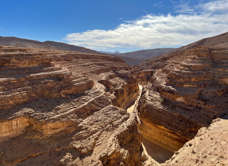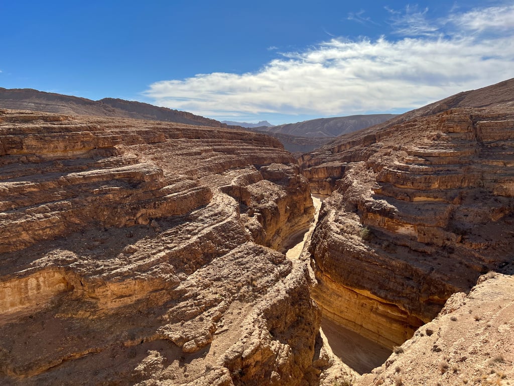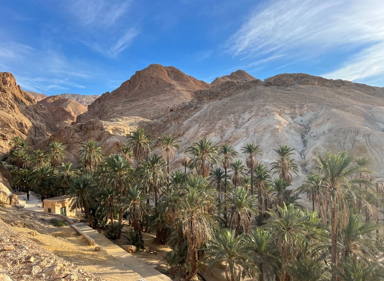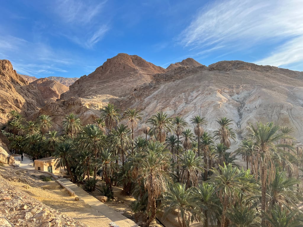 Último día completo en Túnez. Nuestra primera visita fue el precioso oasis de Chebika, a una hora conduciendo desde Tozeur. En este oasis se puede dar un bonito pero sencillo paseo y atravesar un wadi (un río que baja de las montañas) rodeado de palmeras datileras. Continuamos la ruta por carretera, haciendo breves paradas en dos miradores bastante espectaculares: el Canyon Panorama y la Cascada de Tamaghza. Después, cerca del pueblo Tamaqzah, dimos un precioso paseo por un wadi seco bordeado de una vegetación exuberante. El último lugar de la mañana, fue el impresionante Cañón de Mides, a escasos 10 kilómetros de la frontera con Argelia.
