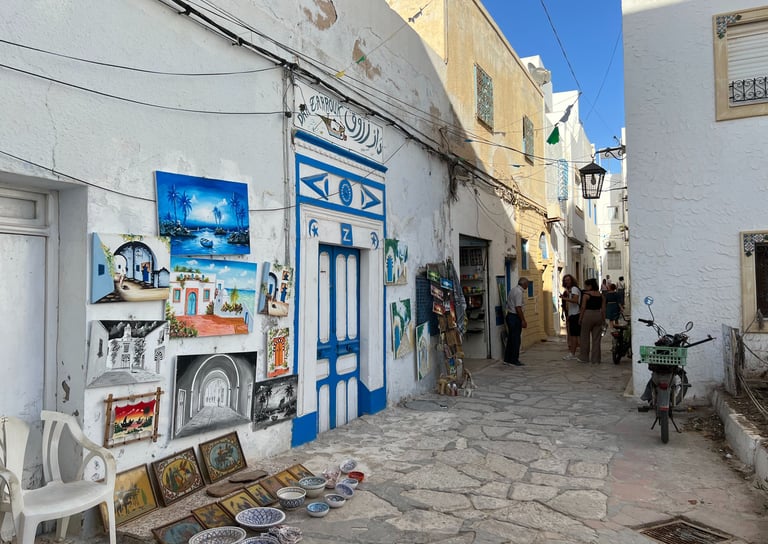 Por la mañana dimos una pequeña vuelta por la medina y después fuimos a desayunar. Sobre las 10 de la mañana, cogimos un Bolt para ir al aeropuerto a recoger el coche de alquiler de BSP Auto. Sin demorar mucho, salimos directos hacia Hammamet, la primera ciudad de la costa tunecina que íbamos a visitar. Llegamos al mediodía y al céntrico Hotel Khella, que tenía una relación calidad-precio inmejorable. Antes de recorrer la ciudad, disfrutamos un rato en la tranquila playa. Ya por la tarde, nos adentramos en la coqueta medina que está repleta de galerías de arte, tiendas de suvenires (con bastante buen gusto) y todas las casas pintadas en blanco y azul. Si queréis saber más sobre la costa de Túnez podéis leer nuestro post. Pero en resumen, al terminar nuestro viaje concluimos que nos hubiera gustado alargar la estancia en Hammamet, ya que nos pareció más agradable y seguro que Susa y Monastir. El mejor plan es ver el atardecer desde el embarcadero, donde suele haber un acogedor ambiente familiar. Para cenar recomendamos el Liberation Restaurant que ofrece platos tunecinos deliciosos a muy buen precio.