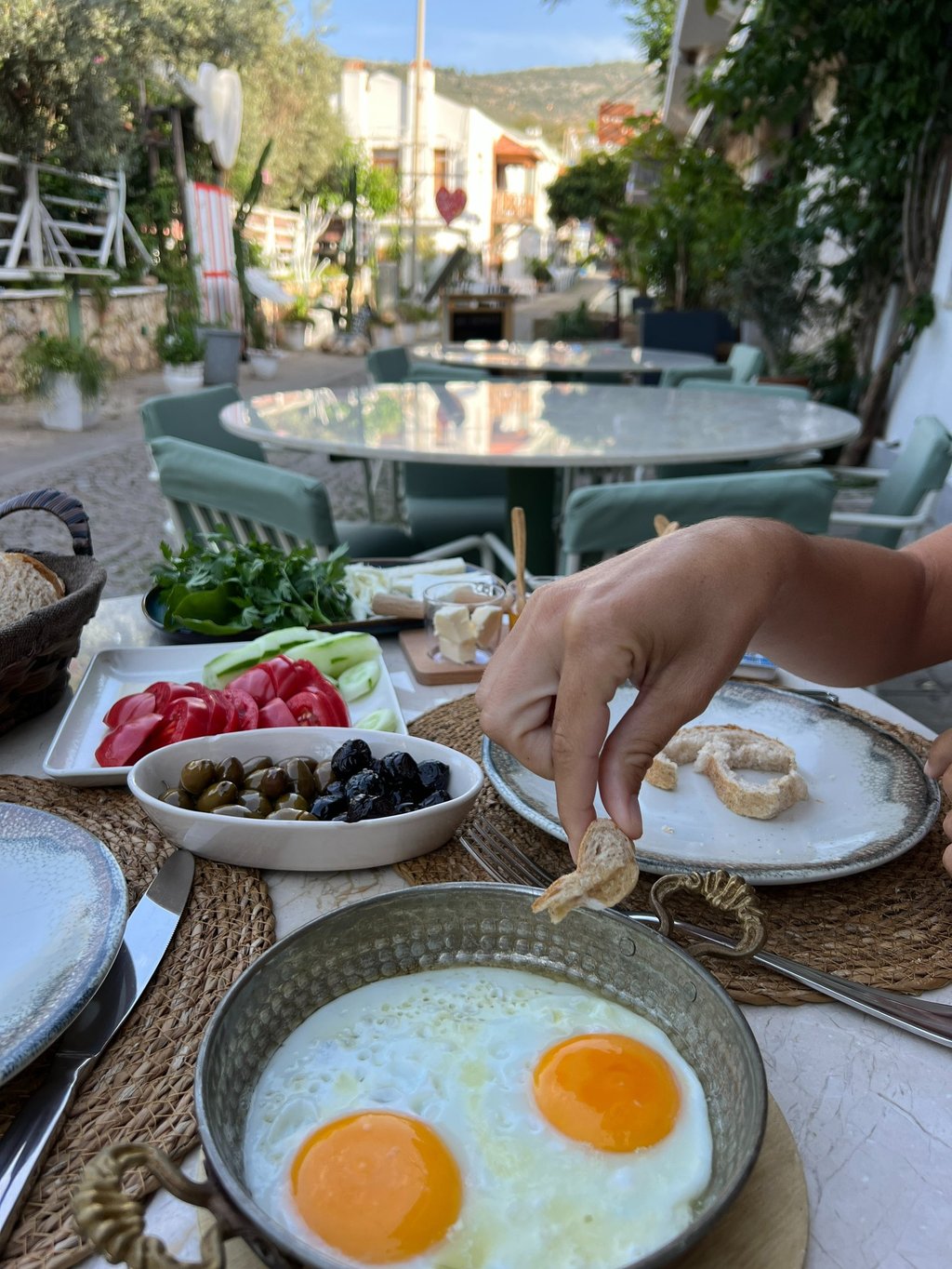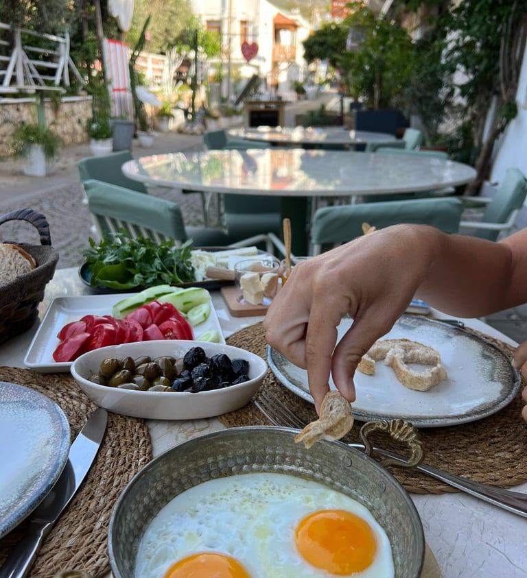 Se suele desayunar bastante tarde (entre las 9 y las 12), es muy abundante y predomina lo salado: aceitunas, tomates de ensalada o asados, verduras, patatas, huevos (es típico el menemen, muy parecido al pisto o la shakshuka), panes, quesos similares al feta, aceite, etc. Nosotros siempre aprovechamos los desayunos para hacer la gran comida del día.