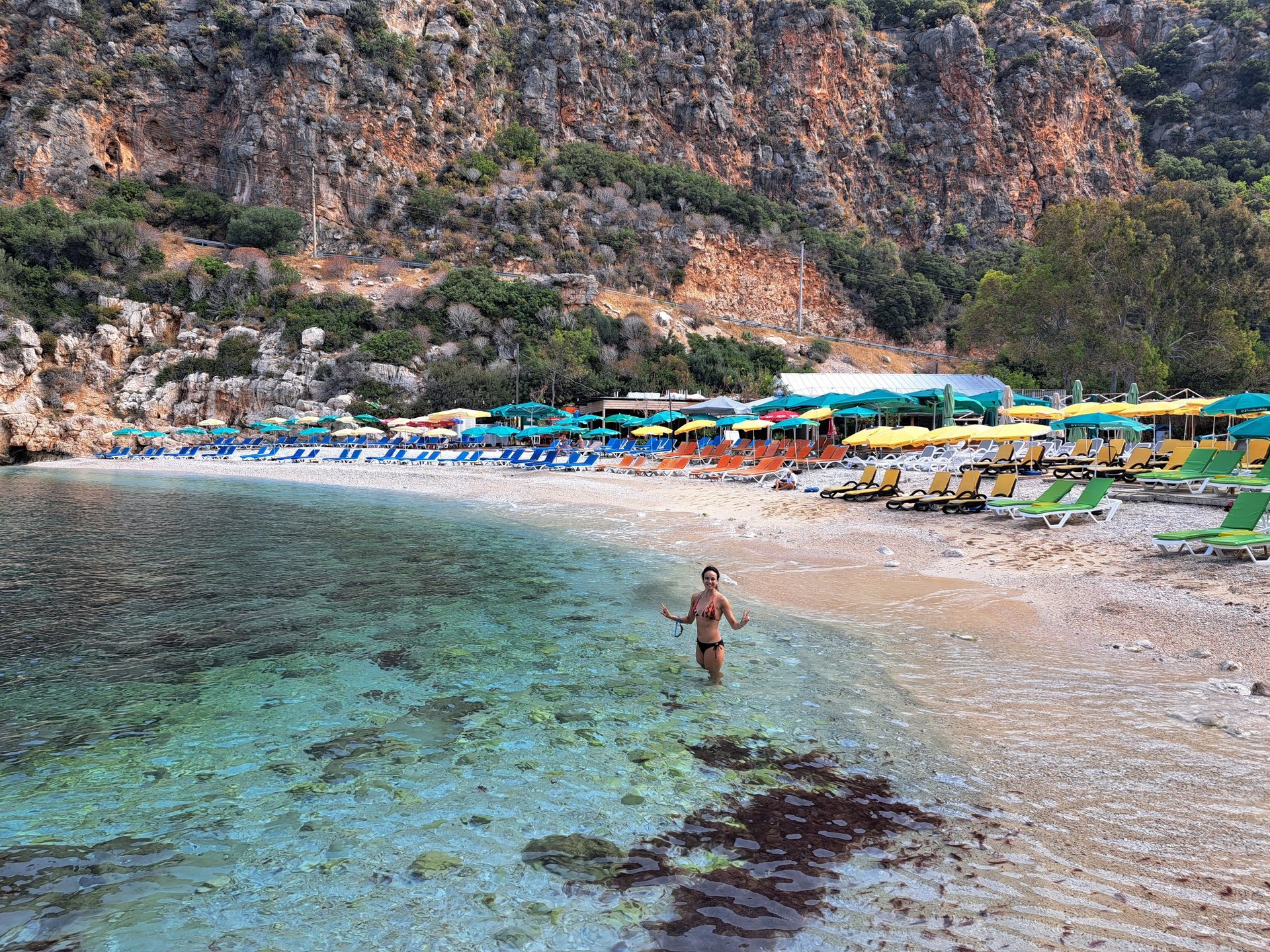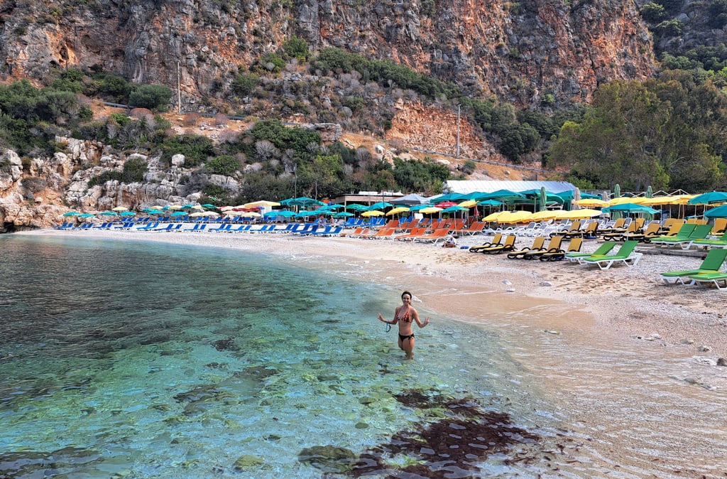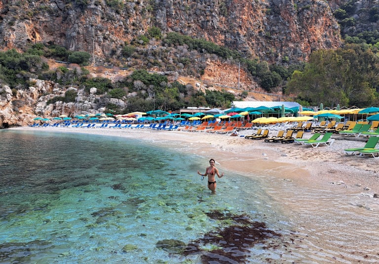 El agua aquí es de un color azul intenso, con una mezcla entre turquesa y esmeralda que parece de otro mundo. Aunque la playa es de arena bastante gorda con pequeñas piedrecitas, la belleza del lugar hace que valga totalmente la pena la visita. Eso sí, al ser tan popular, en temporada alta puede llenarse rápidamente de mucha gente, así que recomendamos ir temprano por la mañana para poder disfrutar de la tranquilidad antes de que lleguen las multitudes. Os dejamos por aquí nuestro artículo de las mejores playas de la costa turca por si queréis organizar un ruta chula y conocer varias.