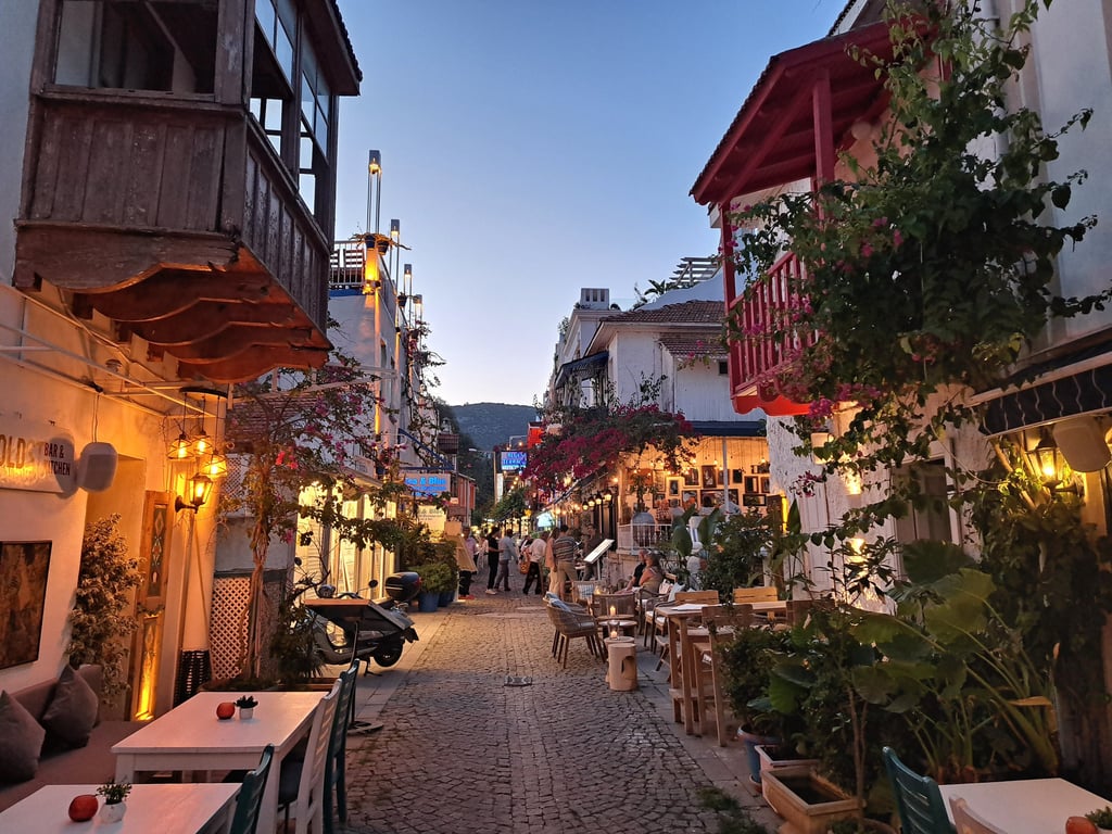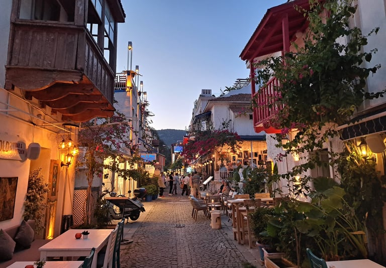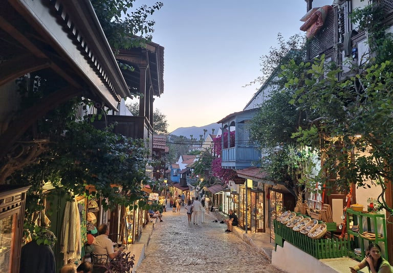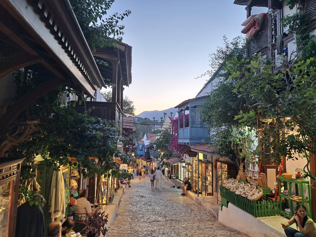 Kalkan es un pequeño pueblo costero que conserva su esencia bohemia y tranquila. Sus casas blancas con balcones típicas de esta zona de Turquía crean una postal perfecta. Sus calles empedradas están repletas de tiendas boutique con productos artesanales, cafeterías con terrazas y restaurantes con vistas al mar. Es un destino ideal para quienes buscan un ambiente pintoresco y relajado, a la vez que un poco “pijo” lejos del turismo masivo de otros rincones de la Riviera Turca. Eso sí, ojo con los precios…