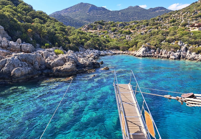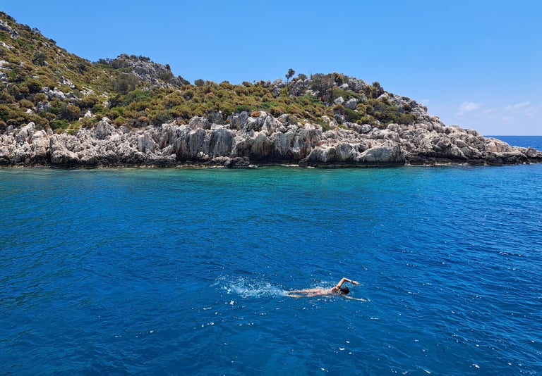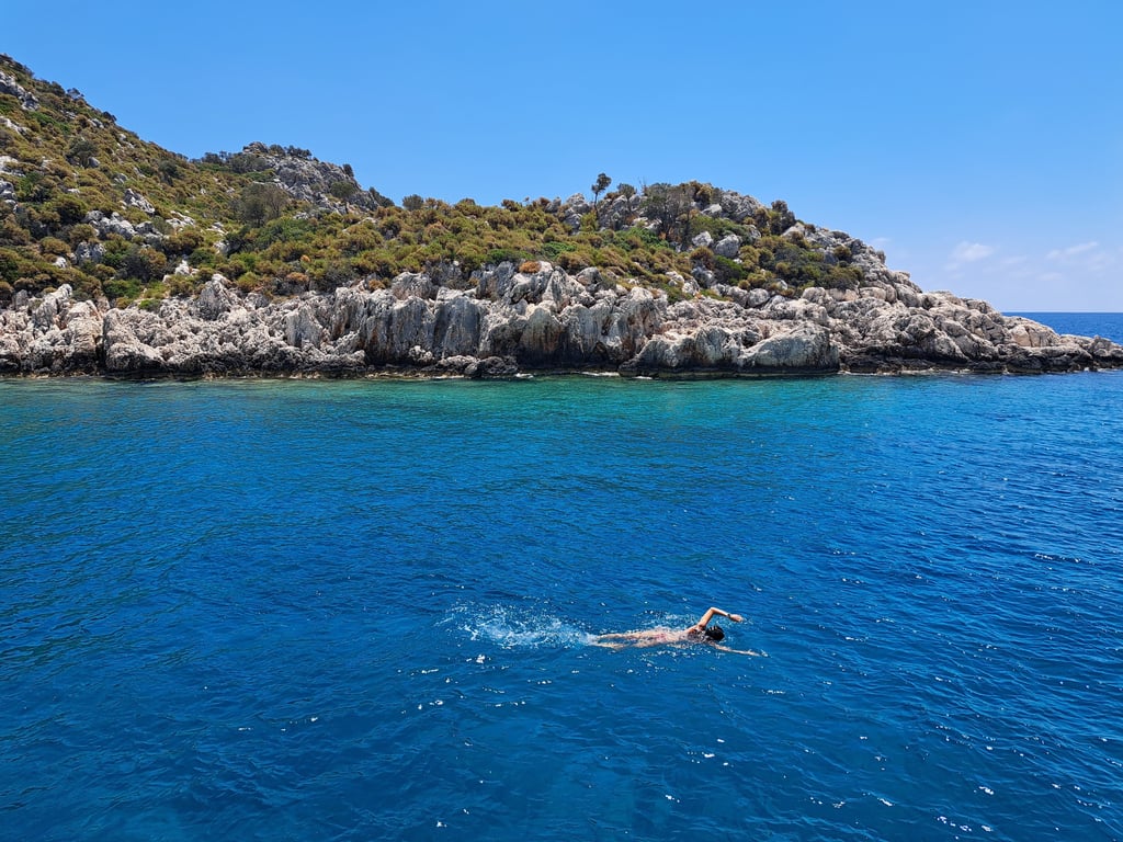 Bahías escondidas y aguas turquesas: durante la excursión, paramos en varias calas espectaculares para nadar en aguas completamente cristalinas y disfrutar de uno de los entornos más vírgenes de la costa turca.