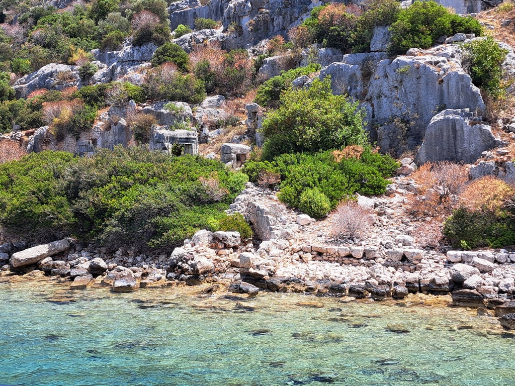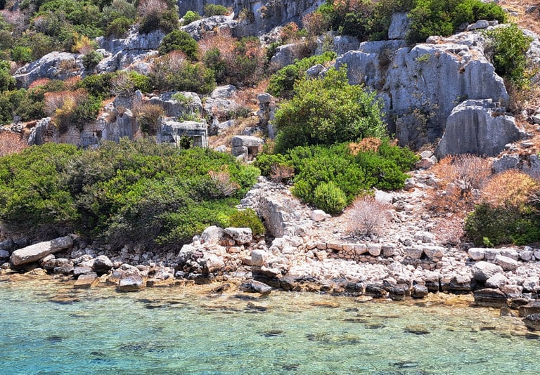 La ciudad sumergida de Kekova: restos de una antigua ciudad licia que se hundió debido a un terremoto en la antigüedad. A través del agua cristalina, aún se pueden ver los cimientos y estructuras de esta misteriosa urbe.