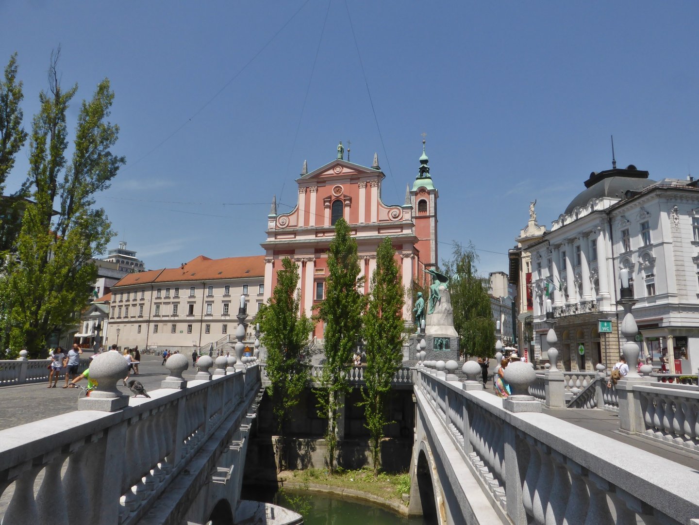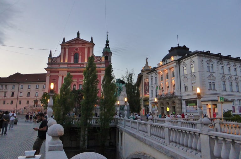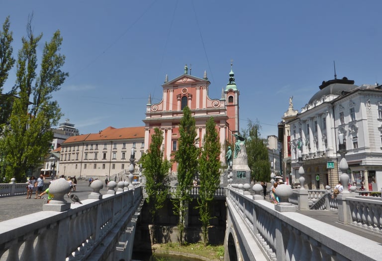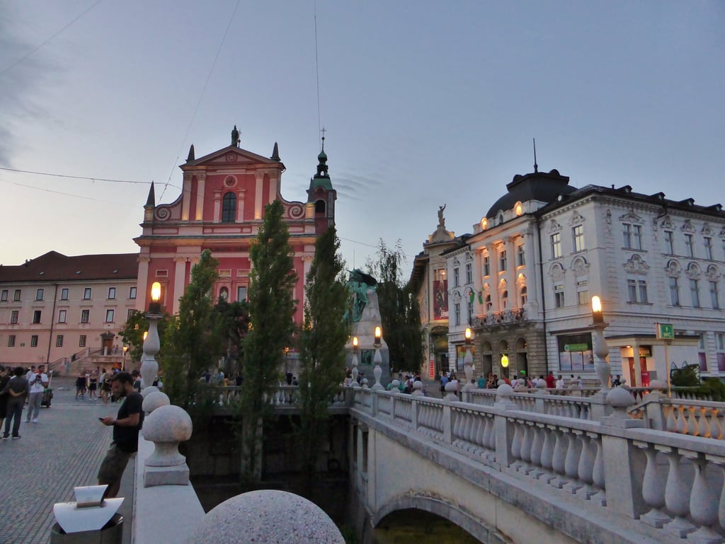 El corazón de la capital es la Plaza Prešeren, presidida por la estatua del poeta nacional France Prešeren. Rodeada de edificios históricos, destaca la Iglesia Franciscana de la Anunciación, con su característico color rosado. Desde aquí se accede al famoso Puente Triple, diseñado por el arquitecto Jože Plečnik, que conecta el casco antiguo con la parte moderna de la ciudad, y que se ha convertido en el icono indiscutible. Este es el mejor punto para empezar vuestra visita y sentir la atmósfera de Ljubljana. También os recomendamos que hagáis un Free Tour si es la primera vez que visitáis Eslovenia para empaparos un poco de la historia y arquitectura de Ljubljana. Por cierto, ya os vamos adelantando que os hablarán bastante del ya mencionado Plečnik, cuyas principales obras se encuentran en Ljubljana.