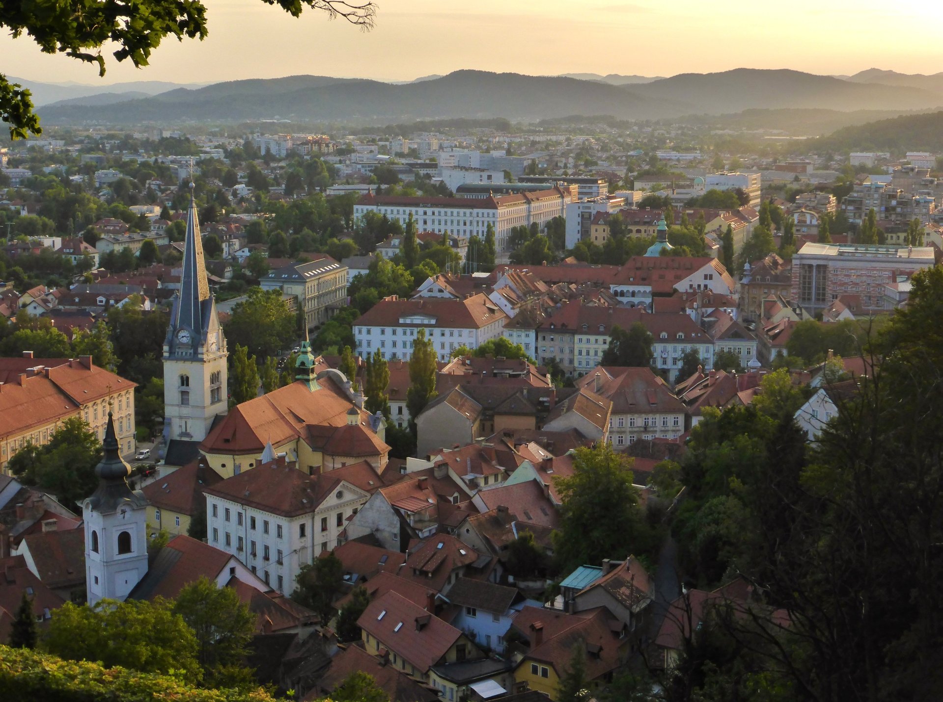 Además del castillo, hay otros puntos con vistas espectaculares de la ciudad. Uno de los más recomendables es el mirador del Nebotičnik, un rascacielos con una terraza panorámica donde podéis tomar un café o un cóctel mientras disfrutáis de la vista de los tejados de Ljubljana. Nosotros subimos y fue una de las mejores panorámicas de todo el viaje que hicimos ese verano por los Balcanes. Os dejamos alguna foto de la vista a continuación. Lo que está claro es que si visitáis la capital eslovena en seguida os daréis cuenta de que cada rincón, plaza, puente y parque es tremendamente fotogénico en esta ciudad, sobre todo al caer la tarde en los largos días de verano.