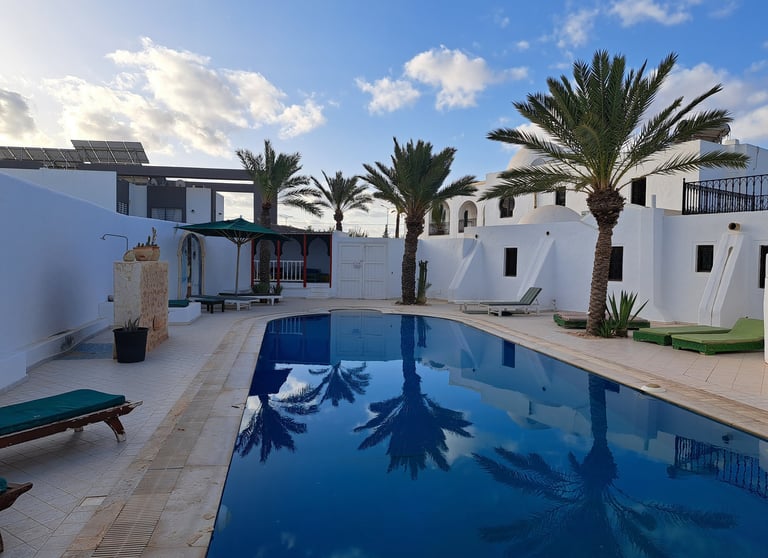 Djerba ofrece una amplia variedad de opciones, desde lujosos resorts frente al mar hasta encantadoras casas de huéspedes en pueblos tradicionales. Para una experiencia auténtica, recomendamos alojarse en una houch, una casa típica djerbiana con patios interiores y arquitectura tradicional. También hay opciones boutique que combinan tradición y modernidad. Nosotros nos alojamos en Maison Leila, sin duda uno de los mejores alojamientos de todo el viaje: piscina, habitaciones cómodas, desayuno excelente y una atención maravillosa. Queda en la zona noreste de la isla y la ubicación fue perfecta para explorar tanto los pueblos y ciudades como las playas.