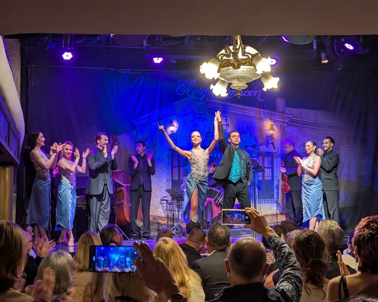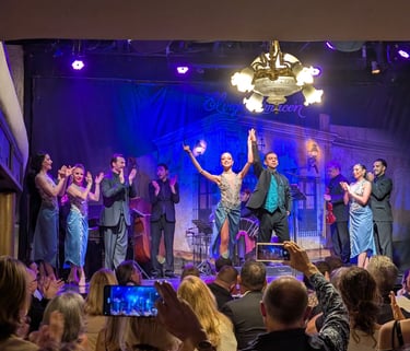 Y después de cenar, llega el gran momento. Cruzáis la calle y entráis en la sala del espectáculo. Se hace el silencio, se bajan las luces… Y empieza el tango. No es un simple show: es una experiencia sensorial. Orquesta en vivo con un pianista sobresaliente (sabemos de lo que hablamos), bailarines elegantísimos, coreografías llenas de energía, emoción y precisión. Hay faldas que giran, miradas intensas, taconeos… Y de repente aparece él, Hugo Marcel, una leyenda viva del tango, que con solo arrancar a cantar os eriza la piel. Su voz llena de historia y sentimiento llenó la sala. ¡Qué lujo poder escucharle en directo! La gente se va entregando y todo esto, como no, acompañado de 2 copas o bebidas que incluye la entrada. En nuestro caso fueron de champagne.