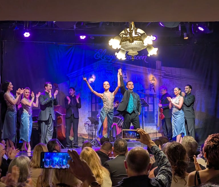 A eso se le suma uno de los momentos más potentes del show: el número con boleadoras, esas sogas con bolas en los extremos que los artistas hacen girar y golpear contra el suelo produciendo un ritmo que retumba por toda la sala. Juego de luces, movimiento, fuerza… Y vuelta al tango más puro para terminar por todo lo alto. Dos horas que se nos pasaron volando. Aplausos, risas, emoción. Una fiesta para los sentidos, sin exagerar. Si visitáis Buenos Aires y os pasáis por el Viejo Almacén, seréis parte de ese viaje, abiertos de ojos y corazón, cóctel en mano. Una visita imperdible.