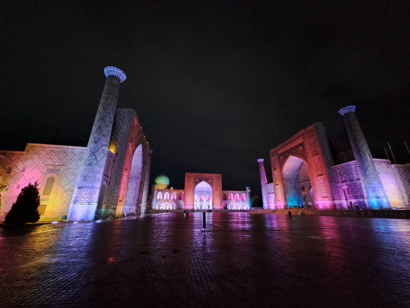 La atracción turística por excelencia del país y de toda Asia Central es, sin duda, la magnífica plaza del Registán, uno de los conjuntos arquitectónicos más fascinantes del mundo. Hasta las diez de la mañana se deja visitar casi en solitario y merece la pena dedicarle al menos un par de horas para disfrutar de la magia que transmite. Asimismo, por la noche no os podéis perder el espectáculo de luces, totalmente gratuito. No tiene un horario especifico y cambia según la época del año. Os recomendamos que preguntéis en vuestro alojamiento el día que estéis visitando Samarcanda. La plaza del Registán está conformada, principalmente, por tres asombrosas madrazas o escuelas islámicas: