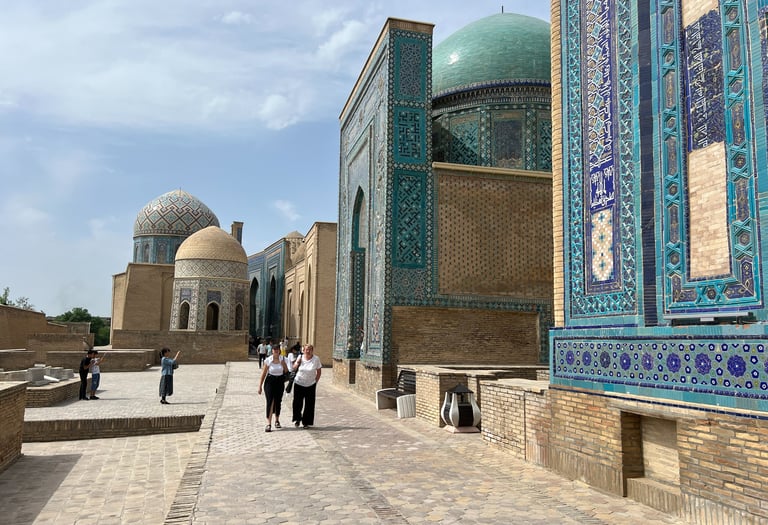 Desde la increíble mezquita recién mencionada, bajando por la calle colindante a unos cuatro cientos metros de distancia, se encuentra la necrópolis Sha-i-Zinda. Es un conjunto de mausoleos de los personajes más ilustres de la historia de Samarcanda que datan desde el siglo XI hasta el XIX. Cuentan con una amplia variedad de estilos arquitectónicos, repletos de azulejos y pinturas, y se considera otro lugar de peregrinación para los uzbekos. El lugar es realmente bonito, pero suele estar demasiado concurrido por nacionales, incluyendo una sorprendente cantidad de excursiones escolares. Recomendamos que os acerquéis a las 9 en punto, justo para la hora de apertura.