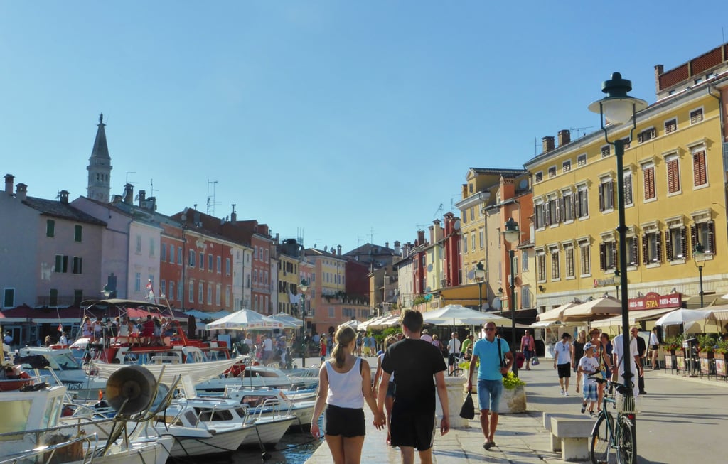 El puerto de Rovinj cuenta gran parte de la historia de la ciudad, con barcas de pescadores que traen la captura del día y restaurantes que sirven pescado fresco con vistas al Adriático. Pasear por el paseo marítimo al atardecer es una de las experiencias más bonitas que podréis vivir aquí, con los tonos anaranjados reflejándose en el agua y la silueta de Rovinj recortada contra el cielo.