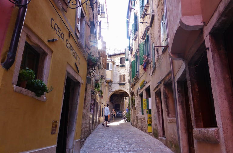 El alma de Rovinj está en su casco antiguo, un entramado de calles estrechas y empinadas que os llevarán hasta pequeñas plazas escondidas, talleres de artistas y rincones llenos de historia. Aquí cada fachada desgastada por el tiempo y cada balcón con flores cuentan su propia historia. Perderse por estas calles sin un rumbo fijo es la mejor manera de sentir la esencia de Rovinj..